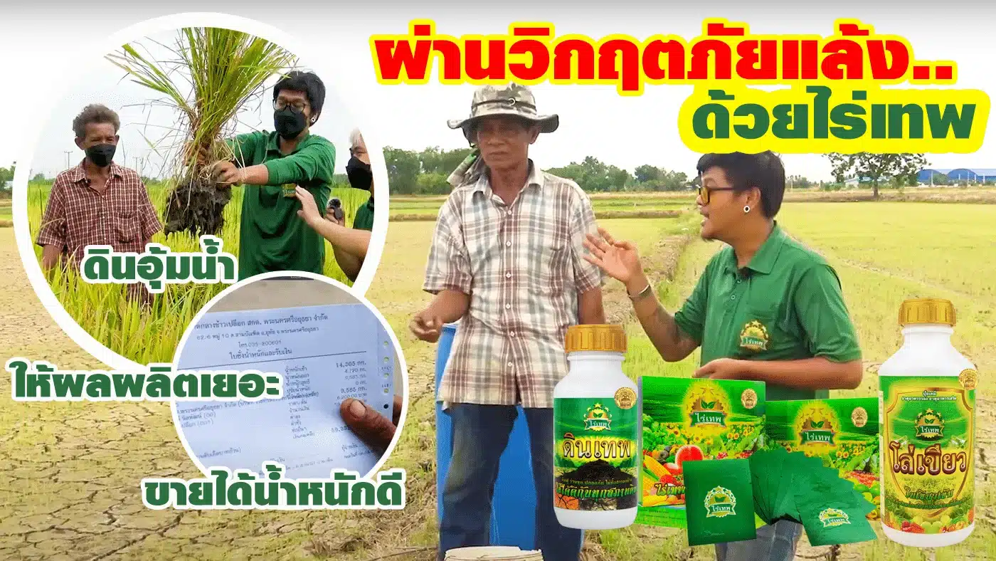 ถึงขนาดที่ว่าน้ำในคลองก็ไม่มีให้วิดมาใช้ ลุงเลยตัดสินใจฉีดพ่นไร่เทพเพิ่มอีก 2 รอบ เพื่อให้ไร่เทพไปช่วยเพิ่มธาตุอาหารให้พืช ส่งผลให้พืชสามารถเจริญเติบโตต่อได้ และไร่เทพนอกจากจะช่วยให้พืชสามารถเติบโตได้ในสภาวะที่ไม่ปกติแล้ว ยังช่วยทำให้ดินมีความอุ้มน้ำ ร่วนซุยไม่แข็งกระด้างอีกด้วย ในขณะที่แปลงนาข้างๆ ต้นข้าวล้มตายเกิดความเสียหายอย่างมาก แต่แปลงนาลุงได้ผลผลิตที่มีน้ำหนักดีนำไปขายโรงสีได้ราคาดีด้วย