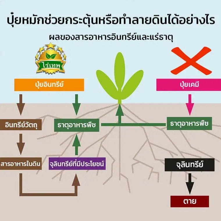 “ไร่เทพ อาหารเสริมพืช เป็นอินทรีย์วัตถุที่ช่วยให้จุลินทรีย์ที่มีประโยชน์เจริญเติบโตและช่วยให้ธาตุอาหารพืช ซึ่งปุ๋ยเคมีจะฆ่าจุลินทรีย์ที่มีประโยชน์ในดินที่เป็นประโยชน์ต่อสารอาหารของพืช”