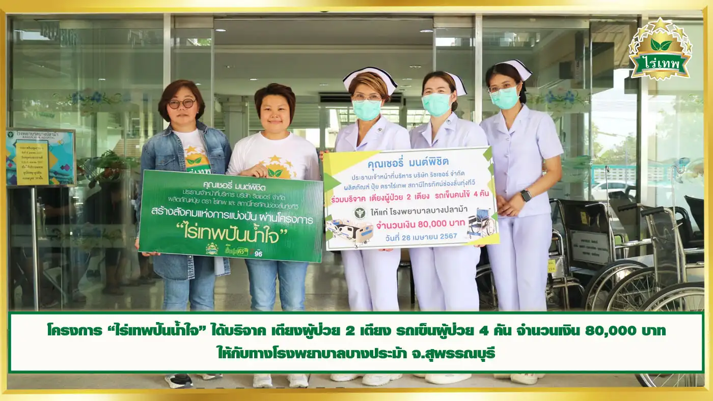คุณเชอรี่ มนต์พิชิต ประธานเจ้าหน้าที่บริหาร บริษัท ริชเชอร์ จำกัด ผลิตภัณฑ์ปุ๋ย ตราไร่เทพ และคณะ ได้บริจาค เตียงผู้ป่วย 2 เตียง , รถเข็นผู้ป่วย 4 คัน จำนวนเงิน 80,000 บาท ให้กับทางโรงพยาบาลบางประม้า จ.สุพรรณบุรี เพื่อเป็นการช่วยเหลือ ส่งเสริมทางโรงพยาบาลให้เกิดประโยชน์สูงสุดแก่สังคม ในโครงการไร่เทพปันน้ำใจ