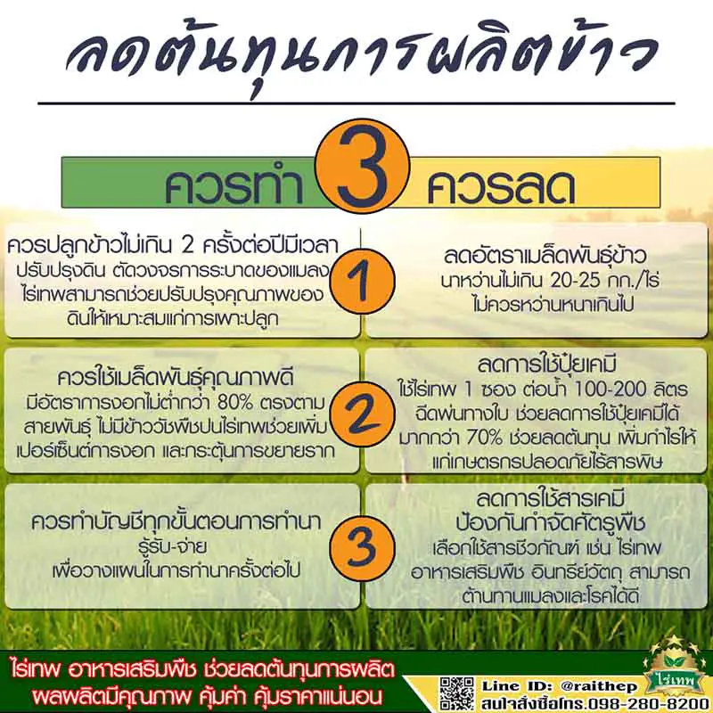 การใช้ไร่เทพ อาหารเสริมพืช ซึ่งจะต้องใช้ในอัตราและระยะเวลาให้ตรงตามความต้องการของต้นข้าวหรือคำแนะนำ และ ต้องใส่ตามชนิดของพันธุ์ จะสามารถลดค่าใช้จ่ายได้ พร้อมลดปริมาณปุ๋ยที่ใช้ลงจากเดิมมากกว่า 70% และถ้าใช้ไร่เทพตามคำแนะนำจะช่วยลดค่าใช้จ่ายในการใช้สารป้องกันกำจัดโรคและแมลงศัตรูพืชได้ด้วย