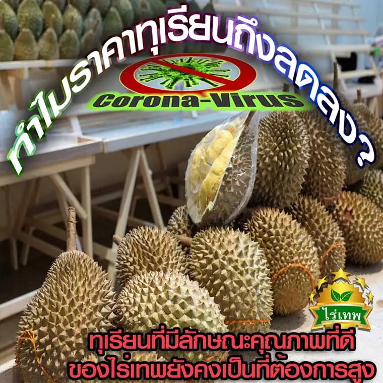 In 2020, the problem of the spread of the Covid-19 virus Affecting the export of fruit trees. In southern Thailand, the product will be released around August 2020. If the situation of the covid-19 virus is prolonged it would affect the sale of durian to China drastically. Normally, wholesale is 100-200 containers / day. But now the wholesale is only 30-50 containers / day. Most Chinese people focus on buying things from Thailand. Dreaded during the month of April, The maximum durian output with regards to the market price is down to 60-80 baht per kilogram. Plus, surveillance of drought and tropical storms cause quantity and quality decline.