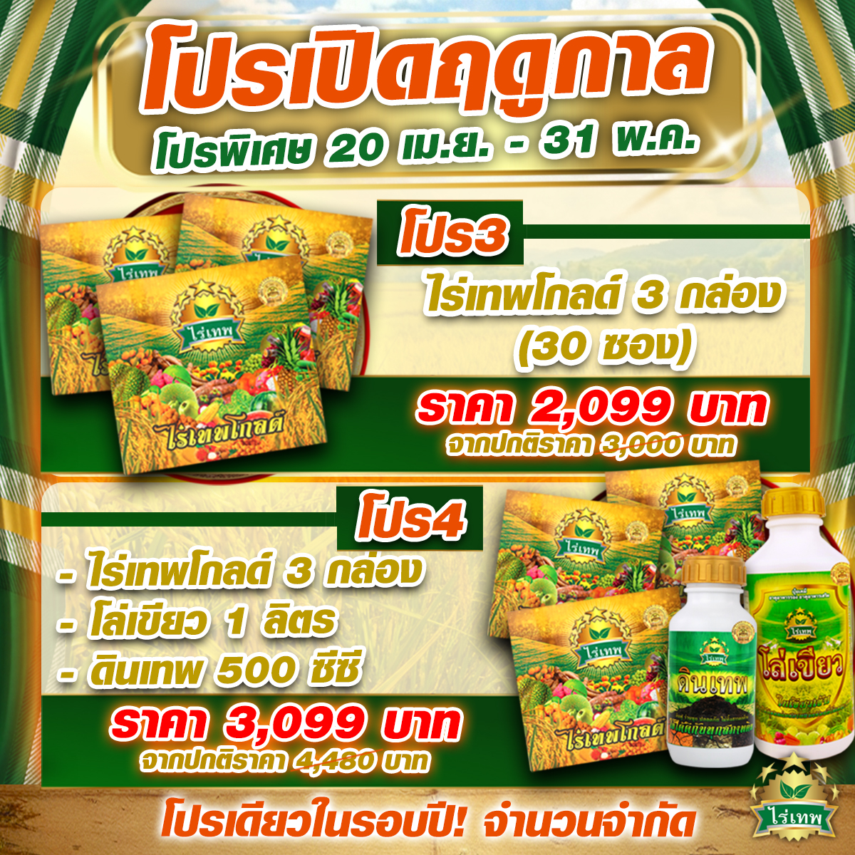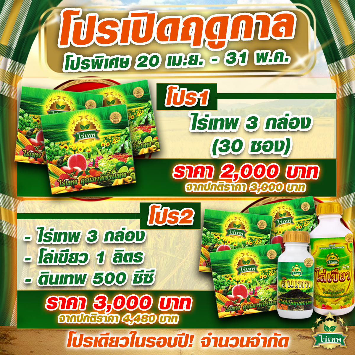 ไร่เทพ เป็นอาหารพืชสูตรผง ปลอดสารพิษ เป็นมิตรต่อสิ่งแวดล้อม เป็นสูตรพิเศษที่มีการเสริมคุณภาพของวัตถุดิบให้มีความเข้มข้น และมีประโยชน์ต่อพืชมากยิ่งขึ้น โดย 1 ซอง ประกอบไปด้วย สารฮิวมิค สาหร่ายทะเล สารฟูลวิค กรดอะมิโนจากสัตว์ทะเล และสารวิตามิน สังเคราะห์จากประเทศอิสราเอล สะดวกต่อการพกพา ลดค่าขนส่งได้มาก จัดเก็บง่าย ขนย้ายง่าย ลดต้นทุนได้มาก สามารถละลายน้ำได้ดีและเร็ว ช่วยทำให้โครงสร้างของดินดี ดินโปร่ง ร่วนซุย น้ำและอากาศถ่ายเทสะดวก รากพืชแผ่ขยายได้ง่าย ผสมน้ำราดโคนต้น จะช่วยปรับสภาพดินเหนียวให้คลายตัวออก สามารถปลดปล่อยธาตุอาหารที่ถูกตรึงไว้ในดินให้พืชกลับนำมาใช้ใหม่ได้ใหม่อย่างเต็มที่ในดินทรายจะช่วยอุ้มน้ำ รักษาความเป็นกรด ด่าง ไม่ให้เปลี่ยนแปลงเร็ว