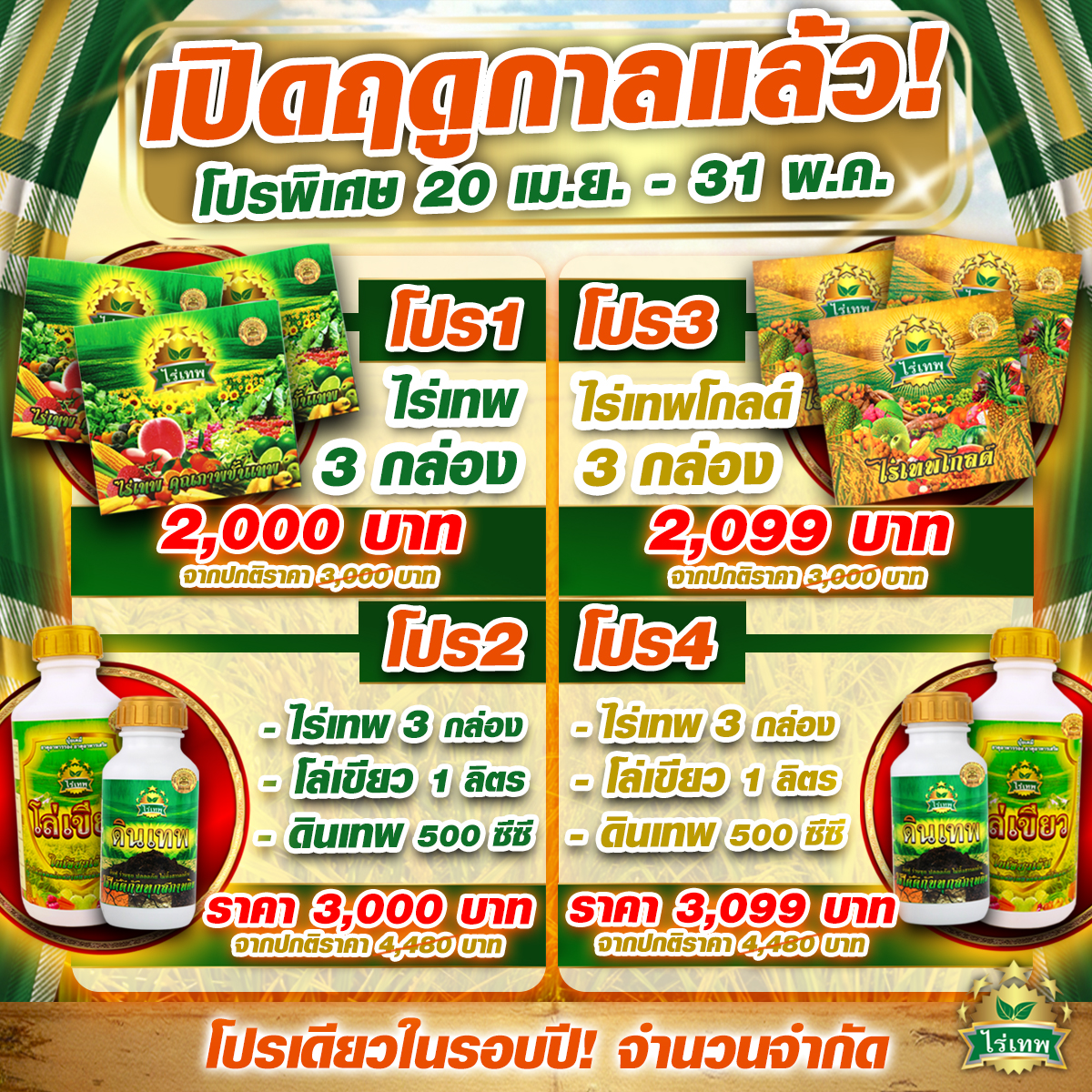 ไร่เทพโกลด์ เป็นผลิตภัณฑ์ที่ถูกพัฒนามาจากไร่เทพ อาหารเสริมพืช เป็นสูตรเฉพาะที่ออกแบบให้ช่วยส่งเสริมการเจริญเติบโตอย่างเป็นระบบ ในช่วงของระยะสะสมอาหาร ระยะติดผล เพิ่มผลผลิต ไร่เทพโกลด์ เหมาะสำหรับ ข้าว มันสำปะหลัง ผลไม้ และพืชดอก