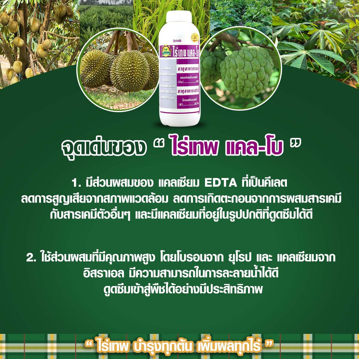 - การพ่น ไร่เทพ แคล โบ ในช่วง ฟื้นต้น จะช่วยให้ทุเรียน มีใบหนา สมบูรณ์
