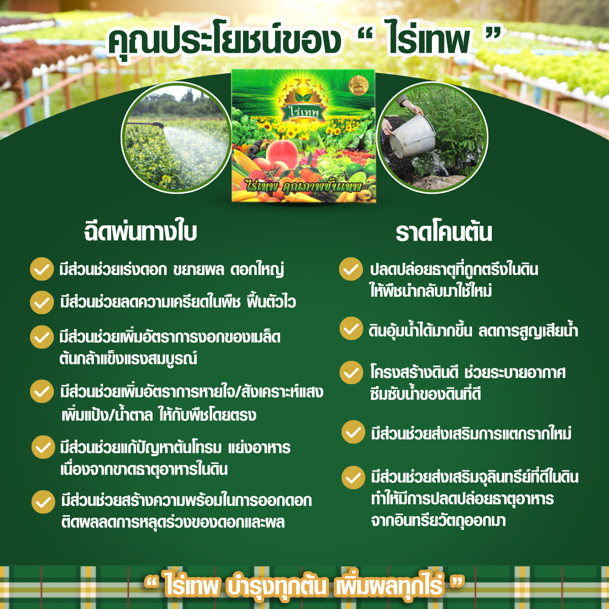 ไร่เทพ เป็นอาหารพืชสูตรผง ปลอดสารพิษ เป็นมิตรต่อสิ่งแวดล้อม เป็นสูตรพิเศษที่มีการเสริมคุณภาพของวัตถุดิบให้มีความเข้มข้น และมีประโยชน์ต่อพืชมากยิ่งขึ้น โดย 1 ซอง ประกอบไปด้วย สารฮิวมิค สาหร่ายทะเล สารฟูลวิค กรดอะมิโน และสารวิตามินสังเคราะห์จากประเทศอิสราเอล สะดวกต่อการพกพา ลดค่าขนส่งได้มาก จัดเก็บง่าย ขนย้ายง่าย ลดต้นทุนได้มาก สามารถละลายน้ำได้ดีและเร็ว ช่วยทำให้โครงสร้างของดินดี ดินโปร่ง ร่วนซุย น้ำและอากาศถ่ายเทสะดวก รากพืชแผ่ขยายได้ง่าย ผสมน้ำราดโคนต้น จะช่วยปรับสภาพดินเหนียวให้คลายตัวออก สามารถปลดปล่อยธาตุอาหารที่ถูกตรึงไว้ในดินให้พืชกลับนำมาใช้ใหม่ได้ใหม่อย่างเต็มที่ในดินทรายจะช่วยอุ้มน้ำ รักษาความเป็นกรด ด่าง ไม่ให้เปลี่ยนแปลงเร็ว