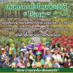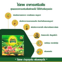 ไร่เทพ เป็นอาหารพืชสูตรผง ปลอดสารพิษ เป็นมิตรต่อสิ่งแวดล้อม เป็นสูตรพิเศษที่มีการเสริมคุณภาพของวัตถุดิบให้มีความเข้มข้น และมีประโยชน์ต่อพืชมากยิ่งขึ้น โดย 1 ซอง ประกอบไปด้วย สารฮิวมิค สาหร่ายทะเล สารฟูลวิค กรดอะมิโน และสารวิตามินสังเคราะห์จากประเทศอิสราเอล สะดวกต่อการพกพา ลดค่าขนส่งได้มาก จัดเก็บง่าย ขนย้ายง่าย ลดต้นทุนได้มาก สามารถละลายน้ำได้ดีและเร็ว ช่วยทำให้โครงสร้างของดินดี ดินโปร่ง ร่วนซุย น้ำและอากาศถ่ายเทสะดวก รากพืชแผ่ขยายได้ง่าย ผสมน้ำราดโคนต้น จะช่วยปรับสภาพดินเหนียวให้คลายตัวออก สามารถปลดปล่อยธาตุอาหารที่ถูกตรึงไว้ในดินให้พืชกลับนำมาใช้ใหม่ได้ใหม่อย่างเต็มที่ในดินทรายจะช่วยอุ้มน้ำ รักษาความเป็นกรด ด่าง ไม่ให้เปลี่ยนแปลงเร็ว